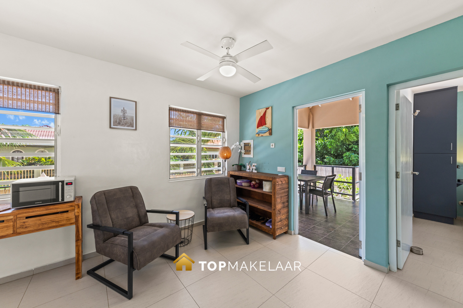 This elevated villa with a swimming pool is situated in the quiet Katoentuin neighborhood, a short distance from the Spanish Water and the beaches of Jan Thiel. From the moment you step onto the property, you'll feel the peace and space that this home exudes. Thanks to the presence of a separate apartment and an attached studio, this is an extremely versatile property – ideal for those who want comfortable living with added privacy, or for those looking for attractive rental opportunities.
